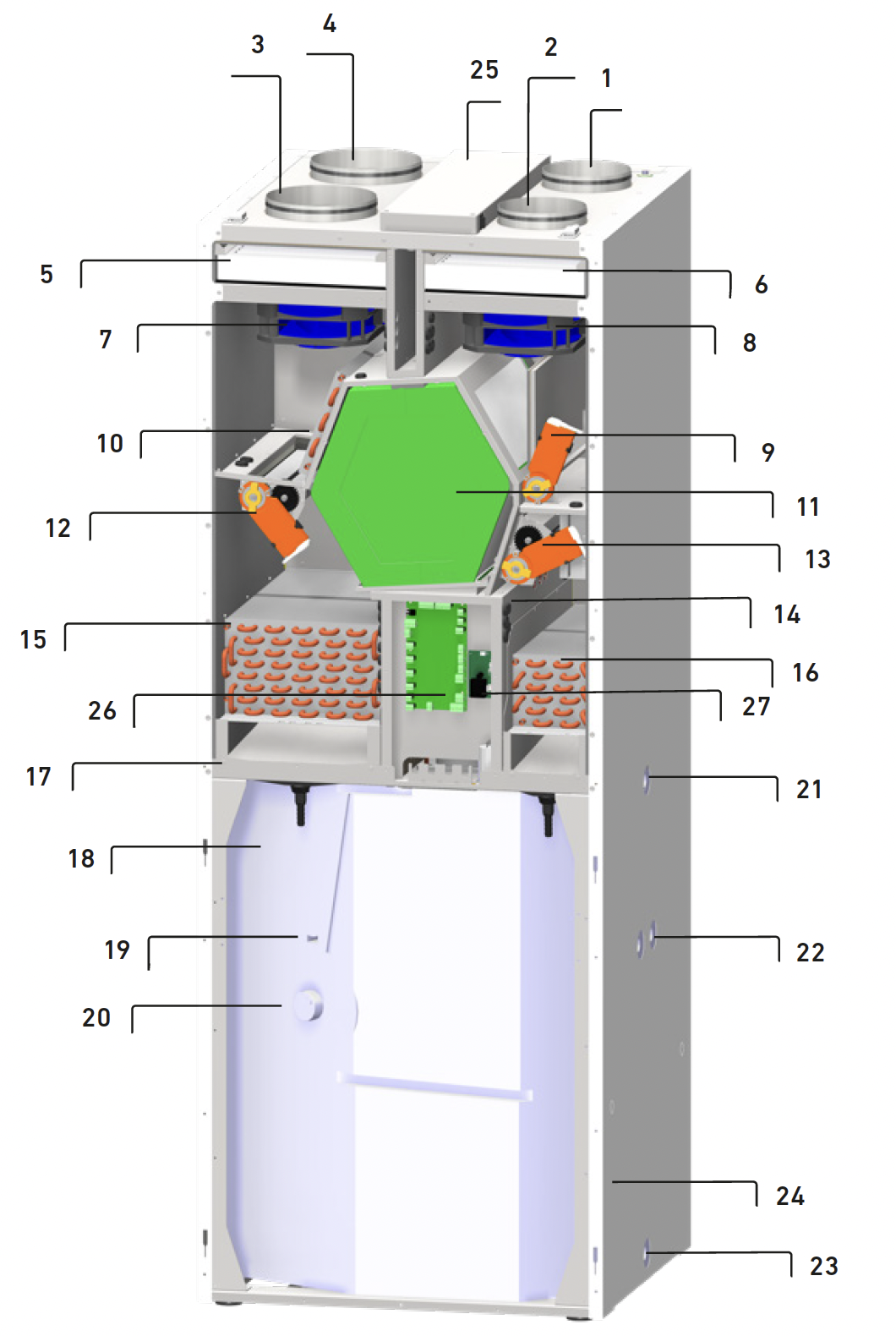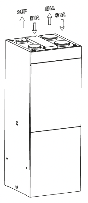 Hrdlo venkovního vzduchu [ODA] | Hrdlo odváděného vzduchu [ETA] | Hrdlo odpadního vzduchu [EHA] | Vyzařování skříně | |